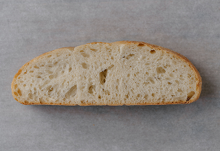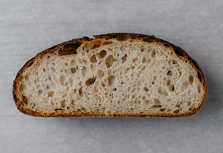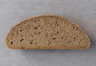 Stone-baked wheat & rye sourdough. A thick, crisp crust with a soft, mild crumb.