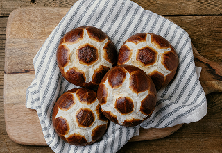 Authentic lye-dipped buns. Signature dark crust with a soft, malty wheat crumb.